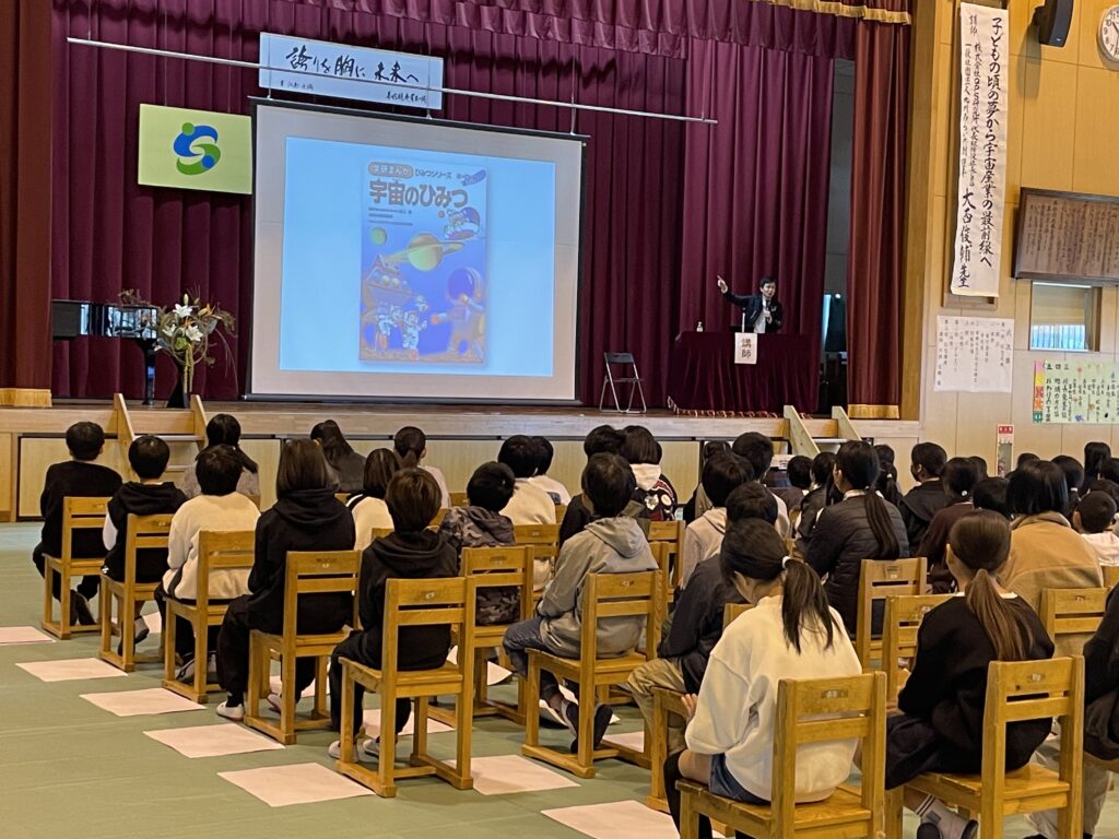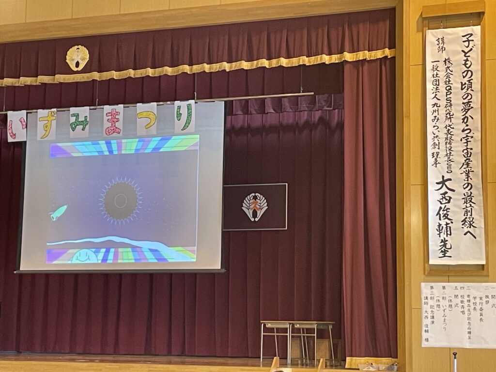 10:25。いよいよ大西登壇の「第3部 記念講演」となりました。同校を平成10年に卒業し、一般社団法人 九州みらい共創では佐賀県出身理事を務める大西は、母校の後輩である児童の皆さま並びに参観者の皆さまに向け、『子どもの頃の夢から、宇宙産業の最前線へ』と題し、自身が宇宙に興味をもったきっかけからお話しいたしました。